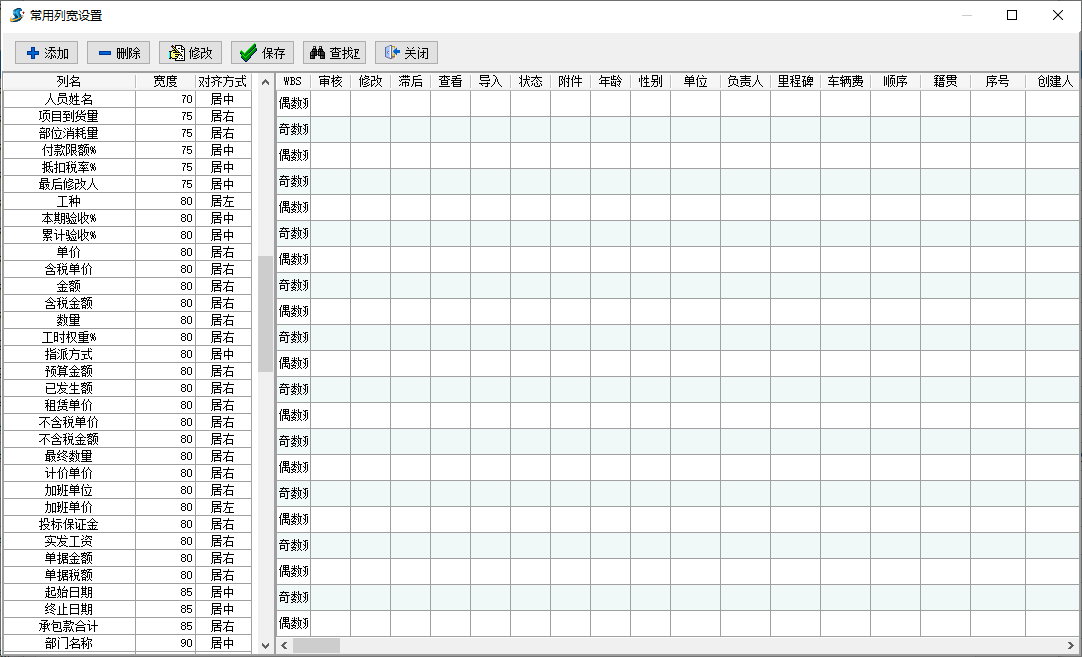 對(duì)單據(jù)表格中不同字段的列寬做單獨(dú)設(shè)置,分字段名、寬度和對(duì)齊方式3種設(shè)置,字段名必須與列表或查詢表格中的字段名一致,否則無法生效;寬度為字段的顯示寬度,原則為恰好或更好顯示當(dāng)前字段內(nèi)容為準(zhǔn);對(duì)齊方式分居中、居左和居右3種方式,原則上推薦數(shù)字類居右顯示,其他字段可根據(jù)用戶個(gè)體習(xí)慣自行設(shè)置,設(shè)置界面圖如下:
