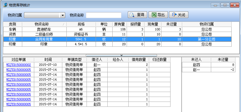 物資庫存統(tǒng)計可以很方便查詢物資的借還記錄,物資借還人以及物資的未還量。當(dāng)物資借用人想借用物資時,可以先查看物資庫存統(tǒng)計,方便借用物資。