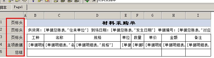 7. 把單據中需要打印的內容,放入表格中。例如:材料的工種,名稱、規格、單位、數量、單價、金額、備注等,如下圖,在第三行中我們輸入名稱,第三行中輸入對應的字段名稱。