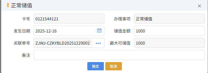 點擊添加,卡號,用途,建卡的方式,以及授權用戶,最后點擊確定完成建卡。只有審核完成后,才能進行儲值的動作,添加下方的正常儲值,就可以輸入本次充值的金額,關聯(lián)單號里選擇關聯(lián)的儲值卡預辦理單,如下圖所示,