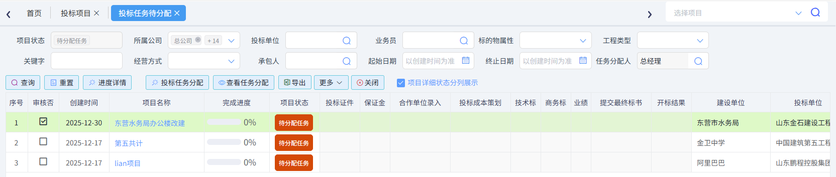 投標項目一覽表可以查看投標項目狀態(tài)、完成度、投標任務節(jié)點、中標單位、中標金額等信息,如下圖所示