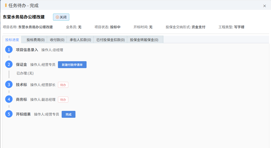 付款申請審核通過后,由財務出納做付款單,完成投保金付款的閉環(huán)。在投標任務已辦中,可看到狀態(tài)的變化。如下圖所示