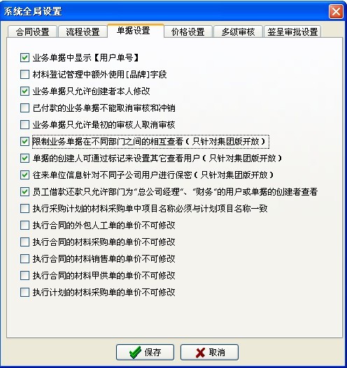 (2)材料采購單、材料銷售單、材料退貨單、外包人工單、外包機械單、運輸車輛單、租賃結算單、其它費用單、設備采購單、設備維修單、設備退貨單、付款申請單、付款單、收款單 (涉及財務的這14個單據) 對于【財務部】也不受該條件限制,可以查看所有部門單據。