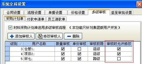 (1) 在采購計劃單、付款申請單、員工請款單中的多級審核設置中,如下圖: