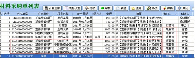 (3)材料采購單、材料銷售單、材料退貨單、外包人工單、外包機械單、運輸車輛單、租賃結算單、其它費用單、設備采購單、設備維修單、設備退貨單、付款申請單、付款單、收款單 (涉及財務的這14個單據) 對于【財務部】也不受該條件限制,可以查看所有部門單據。