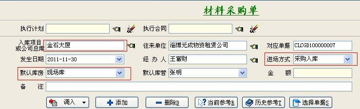 軟件的操作流程:新建【采購計劃單】->相關審核人員打開【采購計劃單列表】-【審核】->(最終審核通過)->新建【采購合同】并填寫合同內容 ->執行采購合同(即新建【材料采購單】-執行計劃單),(進場方式:采購入庫)。
