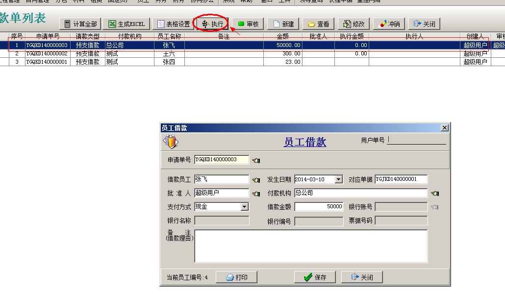 員工請款單可以開啟使用多級審核,審核之后執行付款,生成員工借款單,保存